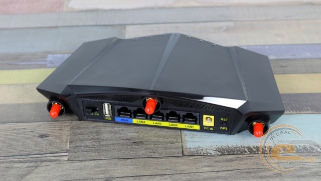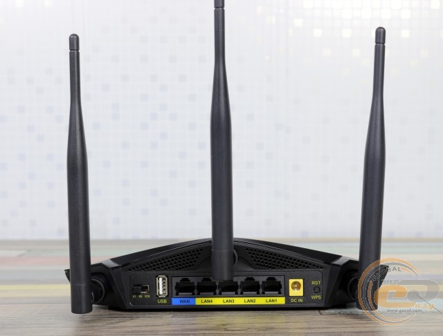 На тильному боці знаходяться три отвори для підключення зовнішніх знімних антен, перемикач потужності, один WAN- і чотири LAN-порти RJ45 класу Fast Ethernet (з пропускною спроможністю до 100 Мбіт/с) для підключення інтернет-кабелю та інших дротових пристроїв, один порт USB 2.0, роз'єм DC In для блока живлення та суміщена кнопка «RST/WPS».
