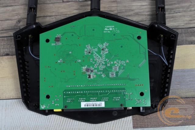 На нижньому боці можна помітити ніжки з гумовими насадками, які трохи піднімають корпус для кращого кондиціонування повітря й оберігають поверхню столу від подряпин, отвори для настінного монтажу роутера та наліпка з технічною інформацією. Вона повідомляє веб-адресу сторінки налаштування й початкові логін і пароль для конфігурації маршрутизатора, які згодом наполегливо рекомендується змінити.