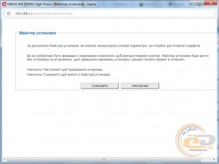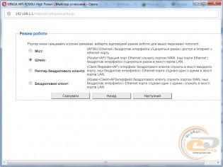 Для початкової конфігурації маршрутизатора необхідно перейти у веб-браузері за адресою 192.168.1.1, вказати логін і пароль («admin» / «admin») і виконати кілька простих кроків за допомогою «Майстра налаштувань». При цьому потрібно вибрати режим роботи пристрою, задати пароль створеної мережі тощо.