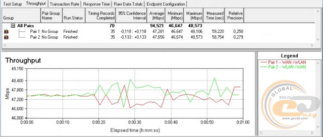 Порівнюватимемо отримані показники з моделлю Vinga WR-N300 Long Range, яка також належить до класу N300. Середня пропускна спроможність при передачі даних в обох напрямках перевищила 130 Мбіт/с, а максимальний показник майже сягнув 71 Мбіт/с. У внутрішнього конкурента середній показник виявився трохи нижчим (128 Мбіт/с), однак максимальний – помітно вищим (94 Мбіт/с).