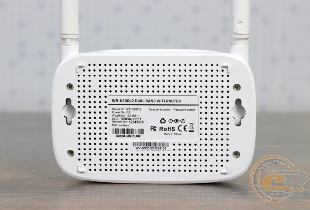 На тильній стороні знаходяться вентиляційні отвори, два отвори для настінного монтажу, чотири мініатюрні пластикові ніжки і наклейка з корисною інформацією. Зокрема, на ній вказані параметри блоку живлення, IP-адреса для доступу до налаштувань, SSID, MAC-адресу роутера і інші відомості.