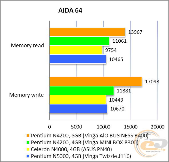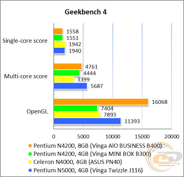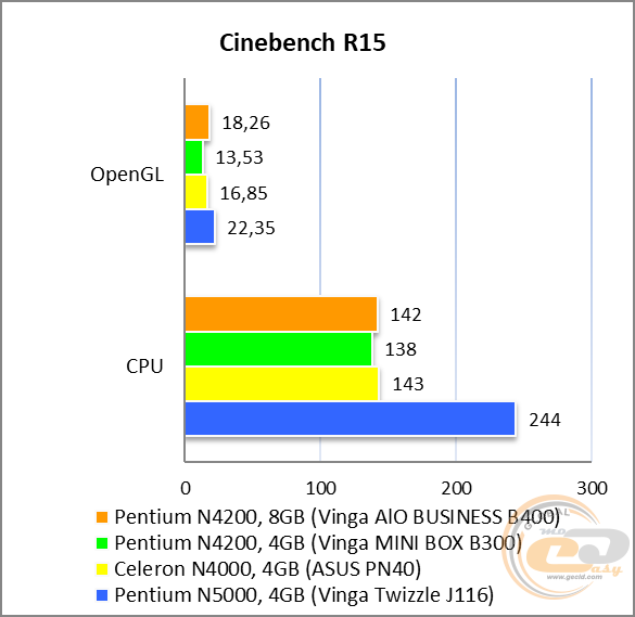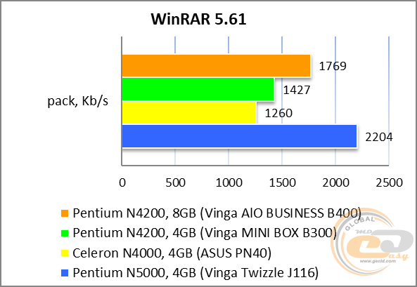 Щоб більше оцінити рівень продуктивності Vinga AIO BUSINESS B400 (A24N4200.864), ми зіставили його результати з раніше протестованими міні-ПК ASUS Mini PC PN40 і Vinga Mini BOX B300 на базі процесорів Intel Celeron N4000 і Intel Pentium N4200, а також з ноутбуком Vinga Twizzle J116 на базі процесора Intel Pentium Silver N5000.