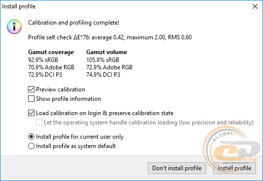Покриття палітри sRGB і Adobe RGB досягає 106% і 73% відповідно. Нагадаємо, що хорошими для непрофесійних моніторів можна вважати показники в районі 90% і 65% відповідно. Простіше кажучи, дисплей навряд чи підійде для професійної кольорокорекції, але рядові користувачі повинні бути задоволені. Та й це куди краще поширених TN-ок з їх жахливою передачею кольору і обмеженими кутами огляду.